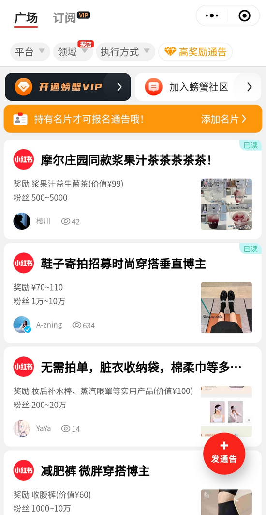 “个人接通告的渠道有很多,微信群、QQ群、朋友商家介绍,还有些通告小程序等等。”孟楠向我们展示其中一个达人通告小程序。页面操作栏分为4个板块:平台、领域、执行方式、高奖励通告。
