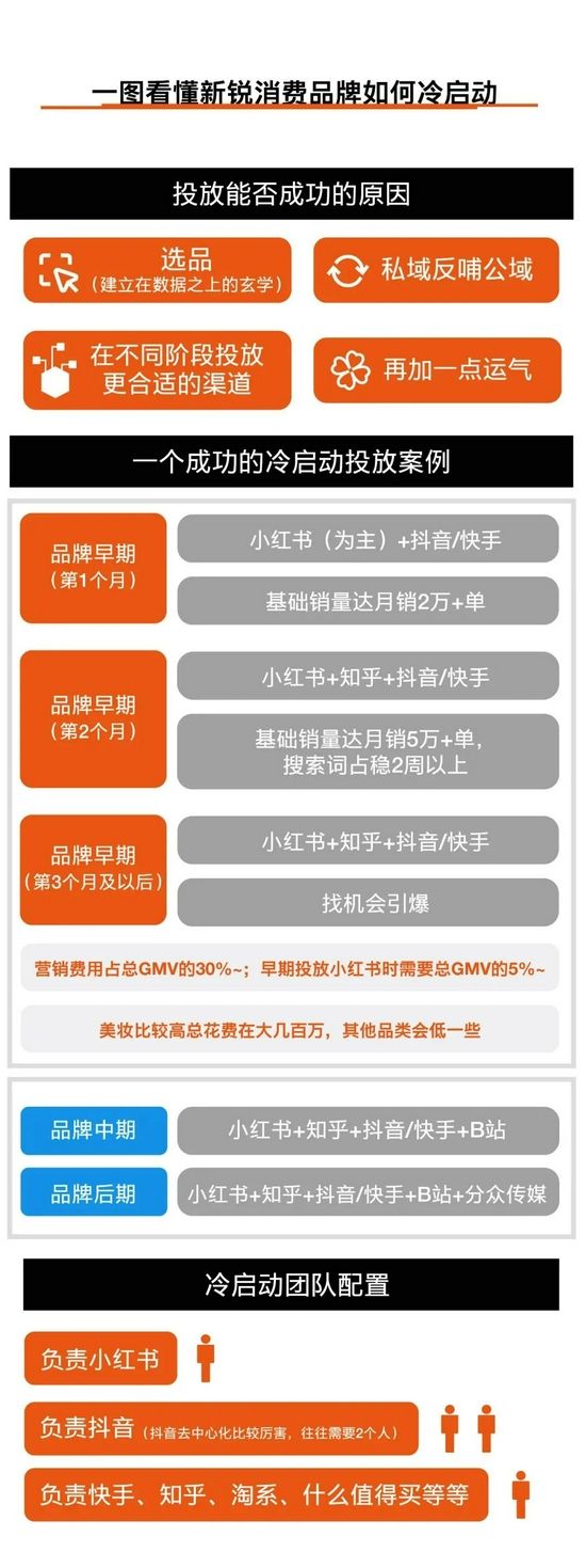 经纬创投《新锐消费品牌冷启动操作手册》一文中,将新消费品牌冷启动分为前中后三个阶段,而小红书在这三个阶段均为主要投放渠道。文中表示,需拿出整体GMV的5%在品牌早期投小红书,并且在整个早期阶段,营销费用需要占到总GMV的30%。另外,在冷启动团队配置中,需一人专门负责小红书的运营。