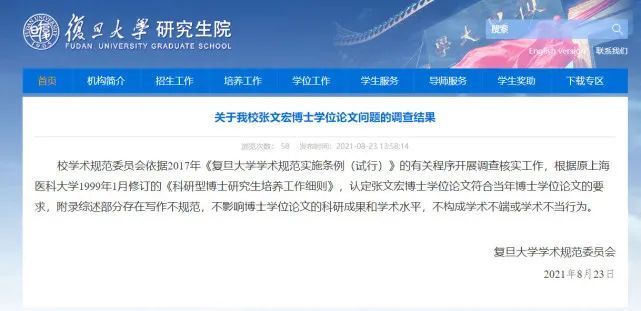 商业 张文宏被举报,刚刚复旦大学公布调查结果:符合博士学位论文要求 2021-08-23 14:45:35 分享 来源:人民政协报刚刚复旦大学研究生院发布调查结果▼复旦大学学术规范委员会依据2017年《复旦大学学术规范实施条例(试行)》的有关程序开展调查核实工作,根据原上海医科大学1999年1月修订的《科研型博士研究生培养工作细则》,认定张文宏博士学位论文符合当年博士学位论文的要求,附录综述部分存在写作不规范,不影响博士学位论文的科研成果和学术水平,不构成学术不端或学术不当行为。复旦大学学术规范委员会2021年8月23日