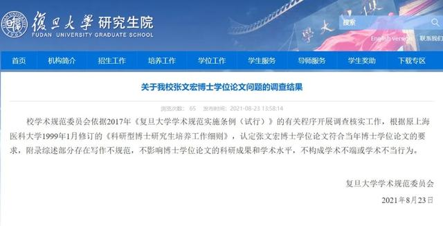 炣燃科技8月23日讯(宏斌)今天,复旦大学研究生院发布“张文宏博士学位论文问题举报”调查结果。校学术规范委员会认定张文宏博士学位论文符合当年博士学位论文的要求,附录综述部分存在写作不规范,不影响博士学位论文的科研成果和学术水平,不构成学术不端或学术不当行为。