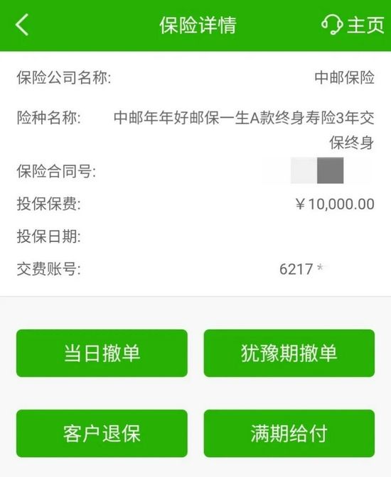 另有用户表示,其母亲在邮储银行某支行办理存款时,被该行业务员推荐办理“存款产品”,一年存款1万元,存三年后可领取4万元。用户下载APP后发现该产品实为中邮人寿保险股份有限公司(以下简称“中邮人寿”)旗下一款终身寿险,并无任何红利。
