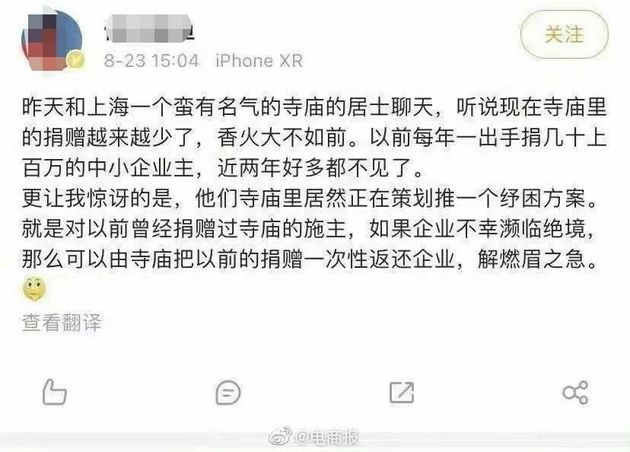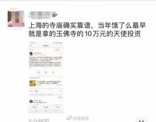 居士还说,这个寺庙里正在策划推一个纾困方案,就是对以前曾经捐赠过寺庙的施主,如果企业不幸濒临绝境,那么可以由寺庙把以前的捐赠一次性返还企业,解燃眉之急。随后,一名创投公司的董事总经理转了上述消息并表示:“上海的寺庙确实靠谱,当年饿了么最早就是拿的玉佛寺的10万元的天使投资。”