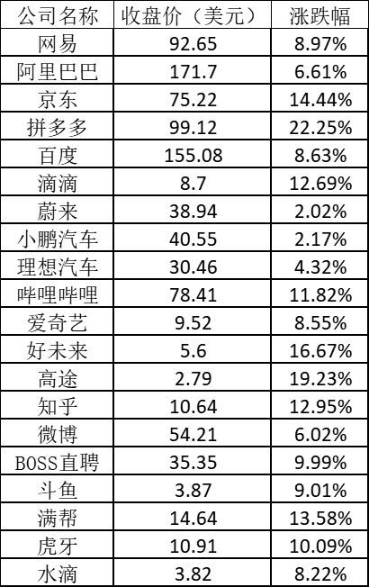 其它热门中概股普遍大涨,其中满帮上涨13.58%,知乎上涨12.95%,滴滴上涨12.69%,哔哩哔哩上涨11.82%,BOSS直聘上涨9.99%,斗鱼上涨9.01%,百度上涨8.63%。