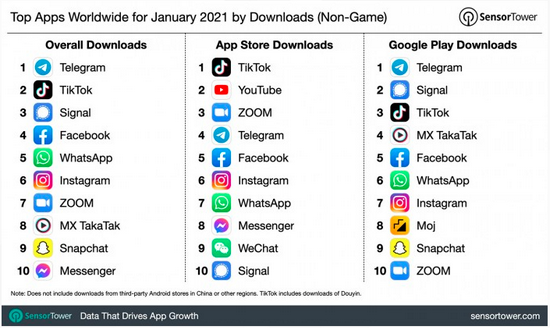 数据分析公司Sensor Tower的数据显示,2021年1月Tik Tok在全球下载量位居第二,而快手三子则籍籍无名。