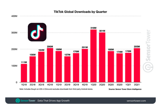 与此同时,Tik Tok成为2021年上半年全球下载量最多的非游戏应用程序,首次安装达到3.83 亿次。