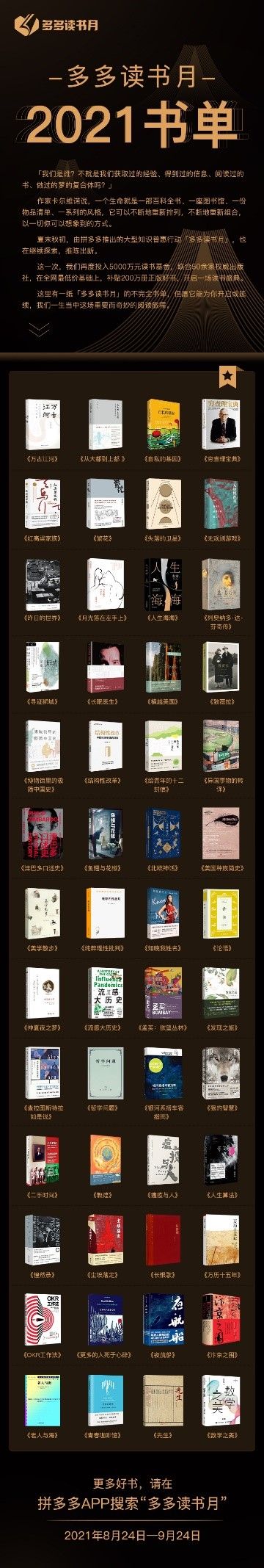 平价好书,全民悦读。由拼多多推出的大型知识普惠行动“多多读书月”,第二季活动将于8月24日至9月24日举行,平台再次投入5000万元读书基金, 并联合人民文学出版社、商务印书馆、上海世纪出版集团、作家出版社等50+国内权威出版社设立线上联合专区,在全网最低价基础上官方补贴200万册正版经典好书,开启一场夏末秋初的读书盛典。