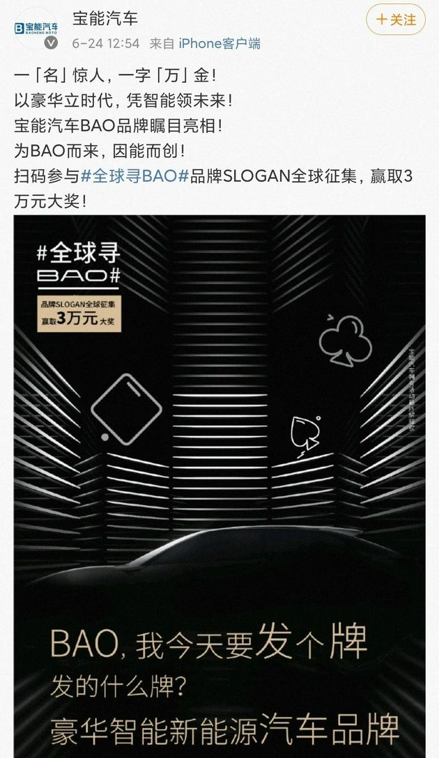 今年6月底,宝能汽车推出了旗下的新能源汽车品牌,英文名为“BAO”。据官方介绍,这一品牌定位为豪华智能新能源汽车品牌,将在未来五年推出16款新车型。