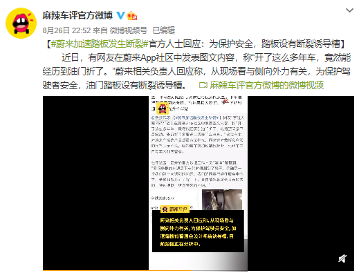 商业 蔚来汽车油门踏板断裂 官方回应:为保护安全 2021-08-27 08:12:45 分享 来源:麻辣车评官方微博近日,有网友在蔚来App社区中发表图文内容,称“开了这么多年车,竟然能经历到油门折了。”蔚来相关负责人回应称,从现场看与侧向外力有关,为保护驾驶者安全,油门踏板设有断裂诱导槽。